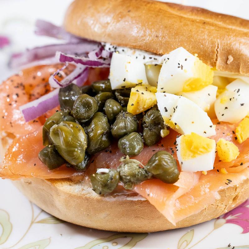 A traditional open-faced bagel topped with cream cheese, thinly sliced red onions, briny capers, boiled eggs, and lox.